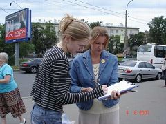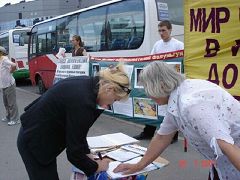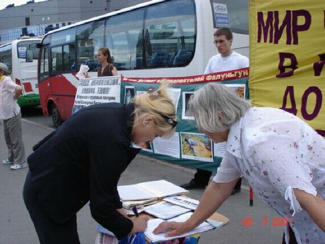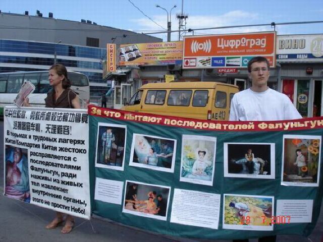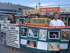 揭露中共活摘法轮功学员器官牟利的真相展板特别引起了市民的注意,一位六十多岁的老人对中共迫害好人的恶行感到愤慨,并表示:我女儿懂汉语,常和中国人做生意,我得好好跟她说说这事儿。她要了各种中文和俄文的真相资料说回去给自己的女儿看。