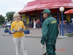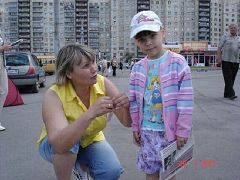 七月二十八日的活动在勃立舍维克大街地铁站附近,展板前面的一个小桌子上摆着法轮大法洪传世界的介绍资料,还摆着一本俄文版的《转法轮》。不知什么时候一个小男孩儿来到这里,拿起《转法轮》出声的读起了〈论语〉,学员问他喜欢这本书吗?男孩儿说:“非常喜欢,在哪儿能得到这本书?”纯真的童心渴望着得法。
