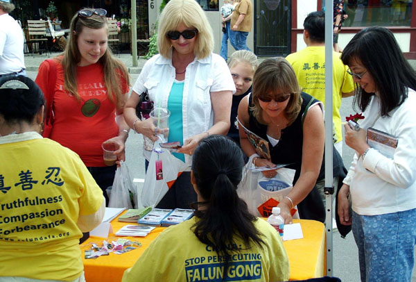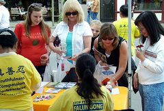 也有不少人想进一步了解中共对中国人民的迫害史。有一对夫妇带着孩子来到摊位前,说他们在报纸上看到对法轮功的报导,希望得到更多学习法轮功的资料,并深入认识中共的历史。那位男士表示他是历史系毕业的,对此非常有兴趣。交谈后,他们满意的带着《·九·评*共产党》的DVD离去。一家从大陆来的人,年老的母亲曾经在大陆学过法轮功,迫害开始后就不敢炼了。此次女儿带着母亲来,希望母亲能重新再学法轮功,而她自己在听学员讲真相后,声明要退*团-、退*队-。