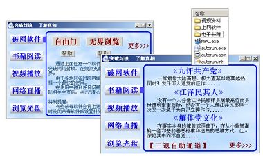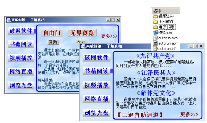 在光盘中加入自启动包,可以在光盘插入电脑光驱后,自动开启一个界面,使光盘包含的视频、书籍、破网软件、网络直播工具等内容一目了然,只需点击界面上的按钮,就可以方便的观看阅读和使用破网工具上网,实现傻瓜式的操作,尤其适合对电脑不熟的人群。