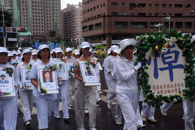 ![]() 中共滥杀善良法轮功修炼人, 一群素净白衣的法轮功女学员手捧受难者遗照走过高雄街头 |