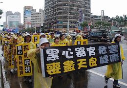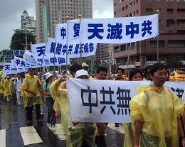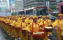 天国乐团雄壮的乐音为游行队伍拉开了序幕,飘零的小雨挡不住气势如虹的正义之师,绵延五、六公里的游行队伍行进在高雄市三多、五福新崛江的热闹商圈。反中共迫害的横幅、旗帜、看板壮盛的擎向天空,街道两旁民众由好奇、惊讶以至明白中共邪恶本质后的唾弃、同仇敌忾,转而对法轮功学员的钦敬表情,环绕在游行队伍周围,这是以正气驱散迷雾的大游行。