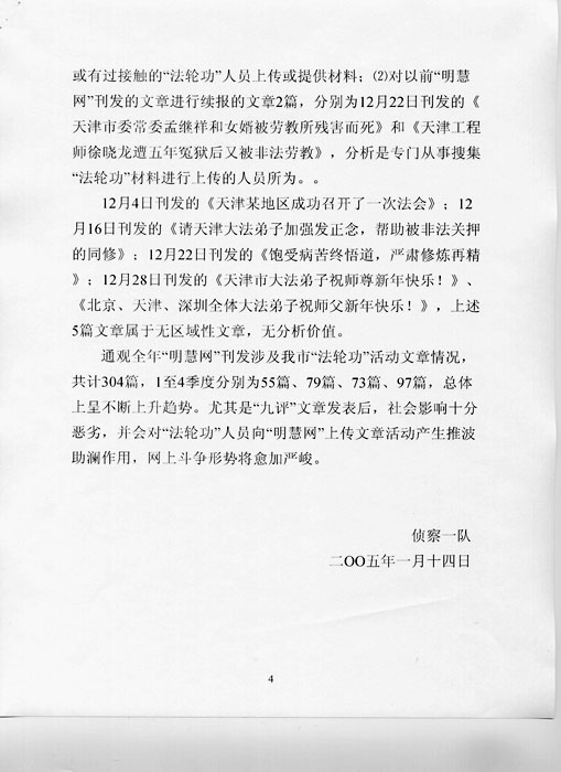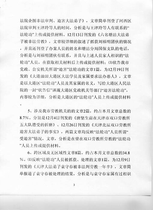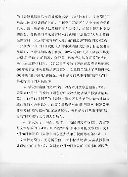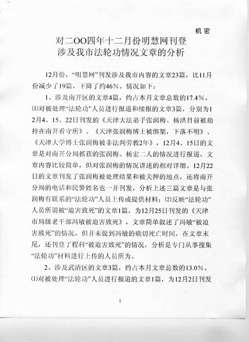 这份中共公安部二十六局的“机密”文件显示,明慧网十二月份刊发的来自天津的二十三篇文章中,半数以上为揭露中共的残酷迫害。