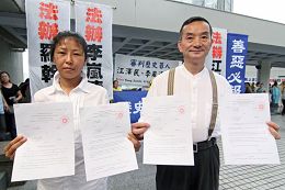 ![]() 二零零七年六月二十八日,朱柯明(右)和傅学英递交民事起诉状获香港高等法院受理,在高院外召开记者会 |