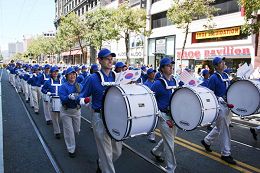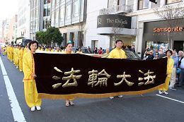 来自大陆的朱先生以前由于受中共的诬蔑宣传,对法轮功存在误解。今天他看到天国乐团的游行队伍,被天国乐团的演奏所感动。不由的对法轮功学员说,你们天国乐团真伟大,了不起!