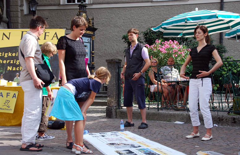 萨尔斯堡法轮功学员在艺术节的开幕当天和第二个周末共举办了两次法轮大法信息日,揭露中共对法轮功学员长达八年的残酷,同时把法轮大法的美好传给来自全世界的民众。