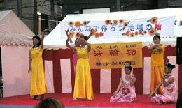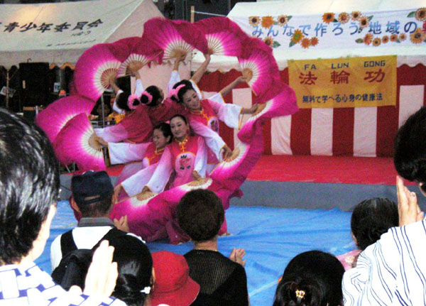 品川是东京人口密集的中心区域之一,也是连接东京和横滨的交通要道。一年一度的盂兰盆节是日本国民的传统节日,这是法轮功学员首次受邀参加。学员们首先表演了“扇子舞”,传统的中国民族舞蹈令日本人耳目一新,主办单位的一位负责人看完此舞后脱口而出:“今年请你们来演出太对了。”之后学员们身着各式服装展示了法轮功五套功法,又表演了歌曲“法轮大法到人间”,舞蹈“花仙”及“金光千手佛”。法轮功学员们洋溢着慈悲和正气的精彩演出把节日气氛推向了高潮,观众们报以热烈的掌声,主办单位对演出赞不绝口,他们说:“观众们情绪高涨,不停的拍照。你们的演出太华丽了,太美了。”