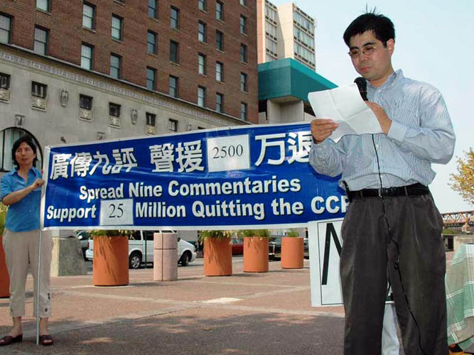 来自费耶特维尔(Fayetteville)的凯伦女士在集会上讲到在今年八月刚刚在中国大陆发生的人权迫害案例:“大约两周前,四十多位法轮功学员在交流心得时被非法抓捕。其中胡燕荣女士被警察迫害致死,她的脸部淤紫,还有血迹。”凯伦说:“法轮功学员被迫害八年了,但他们表现了他们的和平。现在是彻底终止对法轮功的迫害的时候了!”