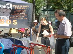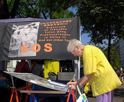 ![]() 学员自制的签名台是一块小小的展板,上面讲述了法轮功学员受到中共迫害的真相,人们纷纷签名制止中共迫害 |