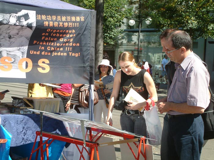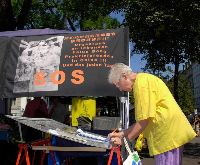 特别在签名台上方的黑色横幅上画着法轮功学员被活摘器官的惨烈场面。除了SOS的红色大字外,还用德语写道:“法轮功学员在中国被活体摘取器官!法轮功学员被活摘器官后被焚尸灭迹!”