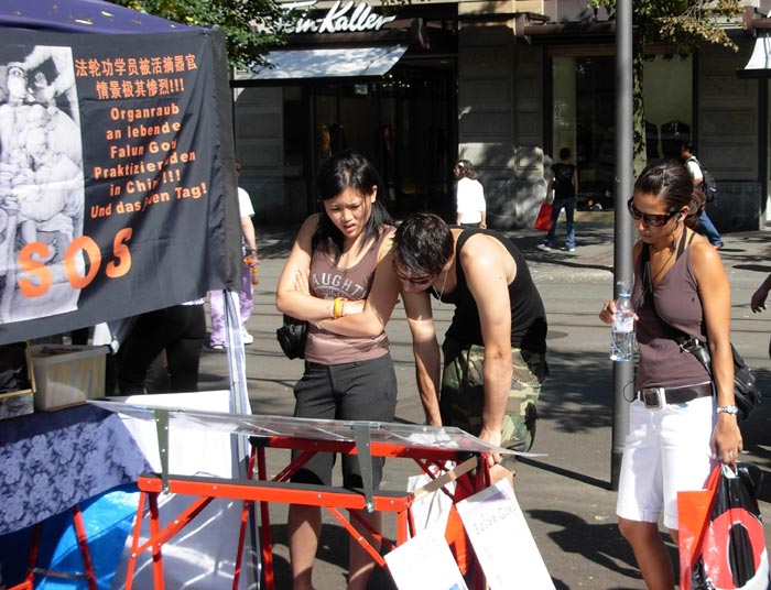 来自意大利、法国、日本……世界很多国家的游客都可以在信息摊位上找到自己母语的真相材料,在各种展出的真相展板上,人们可以看到法轮功洪传世界八十多个国家和八年多来中共对信仰“真善忍”的法轮功学员的血腥迫害。