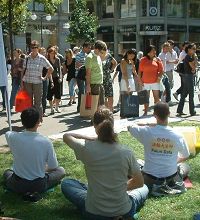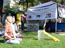 弗扬(Forian)和朋友一起仔细阅读了铺在地上关于法轮功学员八年多来受迫害的照片和说明,并在签名表上签名,要制止这场迫害。在高中时期,弗扬曾在关于中国的讨论课上了解过关于法轮功以及迫害的情况。他认为:“法轮功好,我认为人们可以通过做这样的事情(炼法轮功)平和的生活,对精神上也有帮助,这很好。” (录音(174KB))