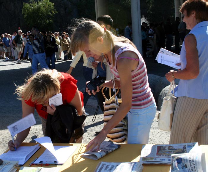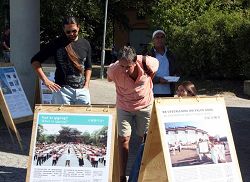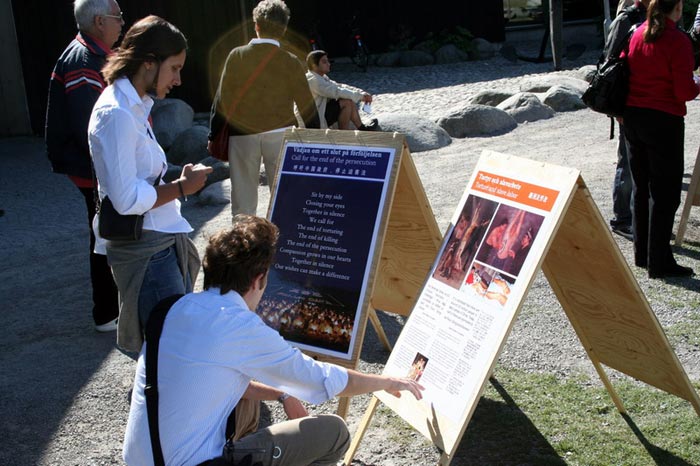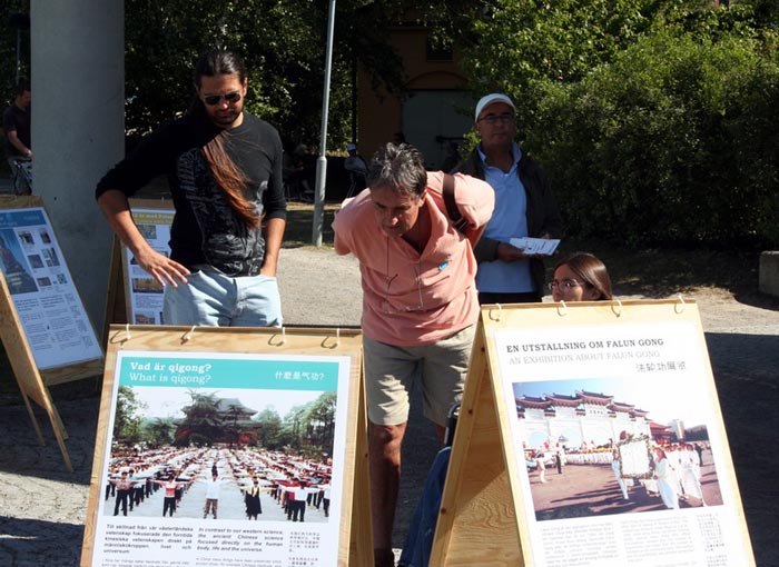 展板刚刚摆出,一位瑞典出租车司机就走向前认真的观看真相展板并和学员聊了起来。听到真相后,他主动要求签名反迫害。他说,“我每次来这里都看到你们在这儿,开始我以为你们只是在宣传你们自己,今天我才明白了,你们是为了别人啊。”他非常感谢法轮功学员告诉他真相。同时他还诚恳的对学员说:“能不能多给我一些真相材料,最近我要接两个旅游团大概有五十多人,我要帮助你们发资料,尽早制止在中国发生的这场浩劫。”