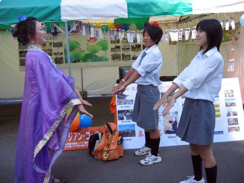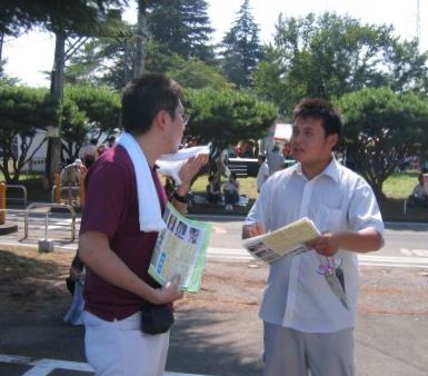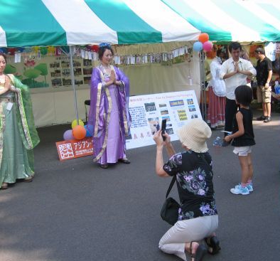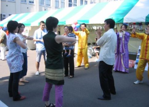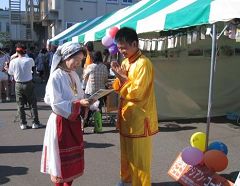 二零零七年八月二十五日星期六,来自七十多个国家的留学生在国际节上展示了各自国家的食品和文化。法轮功学员摆设摊位,介绍代表中国传统文化的法轮功。大家用彩色照片展出了大法洪传的历程,精心制作了大法在世界各地洪传盛况的看板,装饰了五颜六色的气球和带有洪法书签的小莲花。在摊位前摆设了写着大法简介的看板,并由身着中国唐朝传统服装的女学员和穿着黄色炼功服的男学员,不断向人们展示功法。几位学员向行人发法轮功真相资料和漂亮的小莲花。