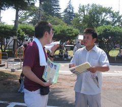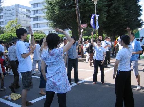 校庆的第二天,有傍晚的野外餐会、露天音乐会、校友交流等活动,参加者包括东北大学的教职员工、学生、来自世界各地的校友、还有中国大陆参加交流的来宾。上百名法轮功学员上午在西公园集体炼功,下午四点开始在仙台市中心的游行。