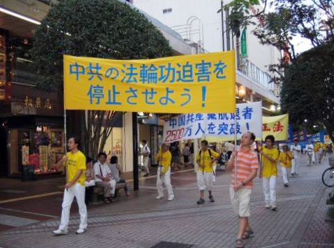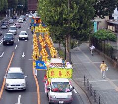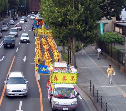 游行队伍由“真善忍”花车引导,随后是雄壮的腰鼓队、手举“法轮大法好”、“法轮大法洪传世界”、“停止迫害法轮功”、“法轮大法是正法”等各种横幅的队伍、最后是翩翩起舞的仙女队。道路两边的行人好象第一次看到这样的队伍,高兴的向学员们招手并起劲的鼓掌。两边大楼里的居民也打开窗户观看。有的行人说真喜欢这支队伍,这是展示真正的中国文化。途中经过正在举行百年校庆的东北大学,来参加校庆的人们也被游行的队伍吸引,停下来观看、拍照、鼓掌。据后来的反馈,法轮功成了当晚野餐会的热门话题,有西方人问,法轮功这么好,为什么遭到(中共)镇压?台湾人说,凡是中共反对的都是好的。大陆的来宾则默不作声。