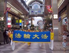 游行队伍到达热闹的商业街,再次震撼路人,引起人们的关注。人们用友好的手势、热烈的鼓掌、欢笑迎接这支传达法轮大法福音的队伍。
