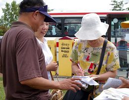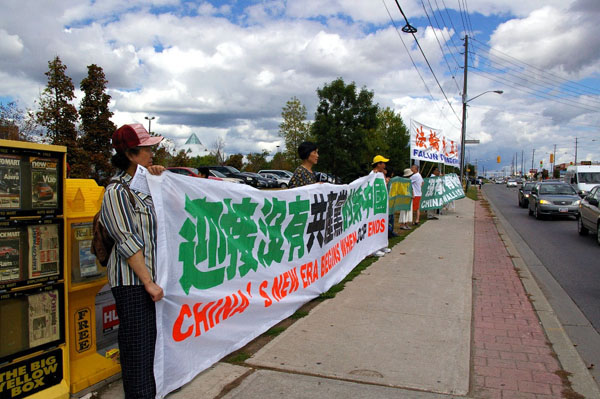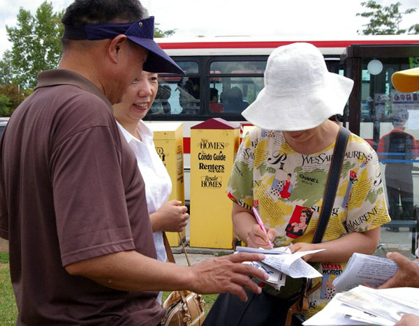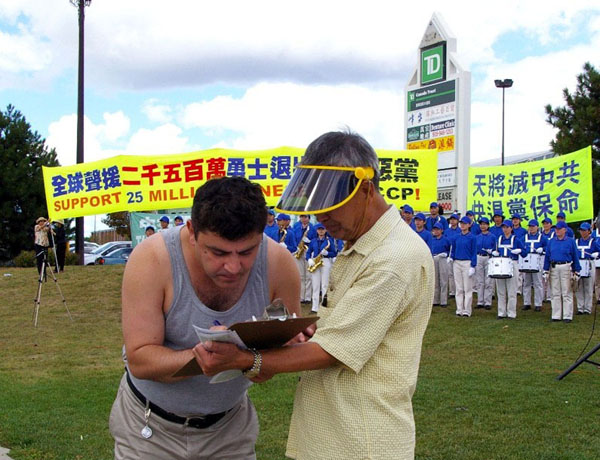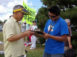 鉴于加拿大总理哈珀将会在九月初参加在澳大利亚召开的APEC会议,加拿大法轮功学员要求他在见胡锦涛时敦促其停止迫害法轮功,因而这两天发起了向民众征签的活动。法轮功学员丁先生介绍说,一位在签名表上签名为Jeff的中国人主动走来要签名。他说他非常清楚中共的邪恶,也知道法轮功一直在受着迫害。Jeff说:“迫害该结束了,我相信你们说的,天快要灭中共了,我也相信我能等到那一天。祝你们好运!”