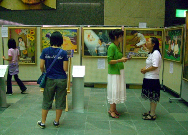画展也吸引了很多有缘人。一位女士说:看到你们传单上的真善忍,就想到肯定是好的,就来了。一位七十多岁的老年妇女,表示想学习法轮大法,第二天就参加了临时的《转法轮》学习会,然后请走了《转法轮》。一位学生在认真听完学员的导览后,当即请走了《转法轮》。