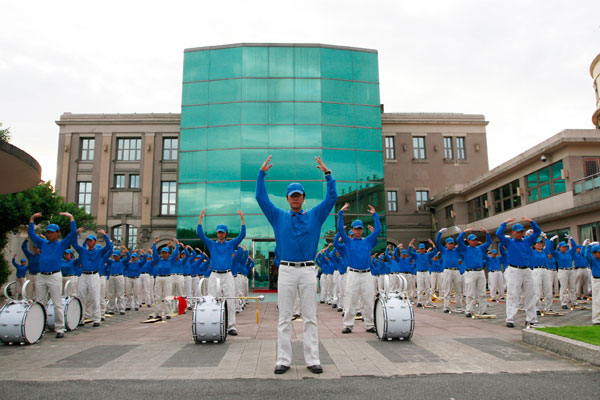 ![]() 基隆放水灯游行演出之前,法轮功天国乐团在基隆市阳明海洋文化艺术馆的广场前炼功 |