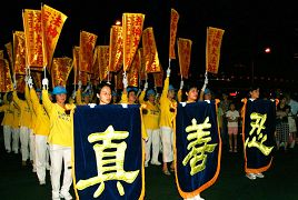 法轮功学员的表演,是游行队伍的压轴戏。司仪介绍了法轮功创始人李洪志先生,以及这个功法的一些特色。她说:「这个队伍是来自社会的各阶层,他们要将法轮大法『真、善、忍』的美好讯息,带给在场所有的来宾。」
