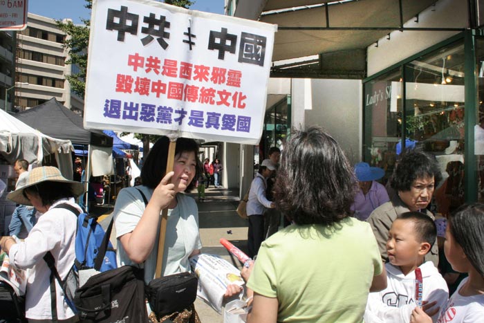 奥克兰市中国城这两天来人山人海,奥克兰街会是秋天中国人在本地的大型活动,有二百多摊位、吸引了二十万的人潮。两天来,许多旧金山湾区的法轮功学员参加了讲真相活动,在约十个街区的范围内发海外版的明慧周报、法轮功真相小册子、《·九·评*共产党》等资料。