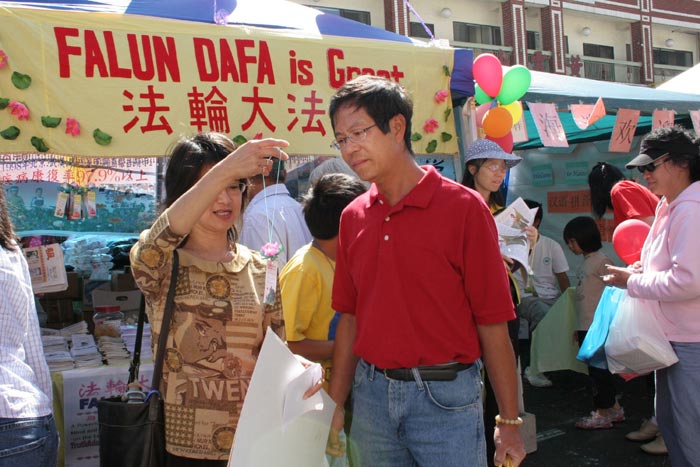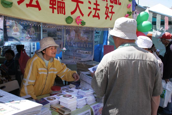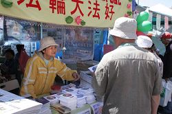 湾区居民Lisa很高兴找到了法轮功学员的摊位。她对中国的道教很感兴趣。现在她发现法轮功包含了道家和佛家的内涵,而且还能够帮她摈弃恶习,减轻压力,她很兴奋。在询问到哪里能够购买到《转法轮》的书籍后,才满意的离去。