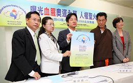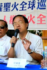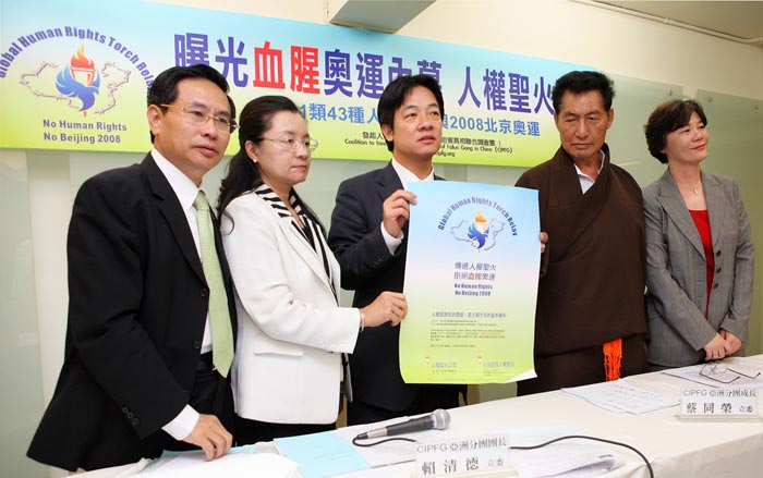![]() 立委赖清德(中)举行「公布中共公安部门十一类四十三种人不得参加北京奥运」记者会,谴责中共罔顾人权,并宣布「人权圣火」巡回全球,揭露中共迫害人权真相 |