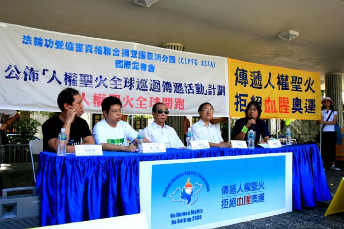 ![]() 「法轮功受迫害真相联合调查团」亚洲分团,八月二日分别在台北和香港召开记者会,宣布「人权圣火全球巡回传递活动」圣火点火仪式,将于八月九日即距离北京奥运开幕刚好一年的时间,在希腊雅典举行。图为香港记者会现场。 |