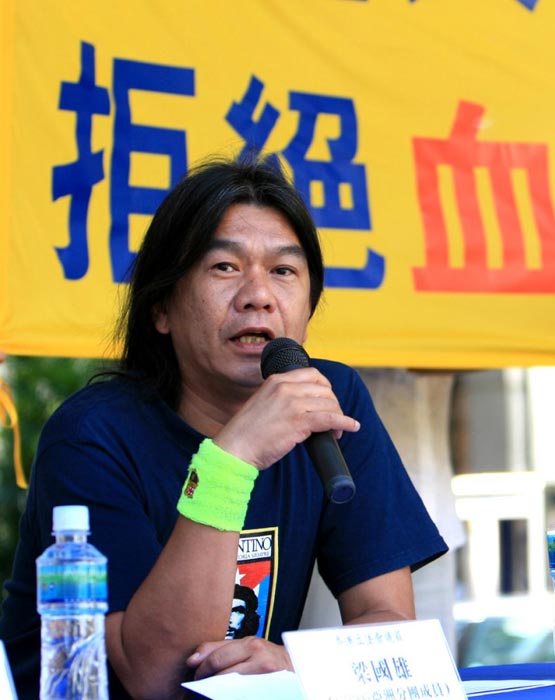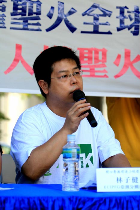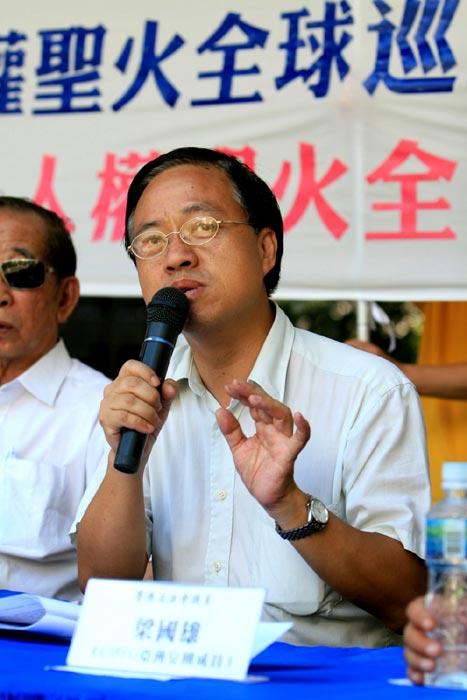 ![]() 梁国雄表示,奥运由染满鲜血的中共政权举办是一种耻辱,中共对法轮功学员的迫害尤甚 | ![]() 林子健则指出支持人权圣火是良知的表现,与中共举办奥运的目的形成强烈的对比 |