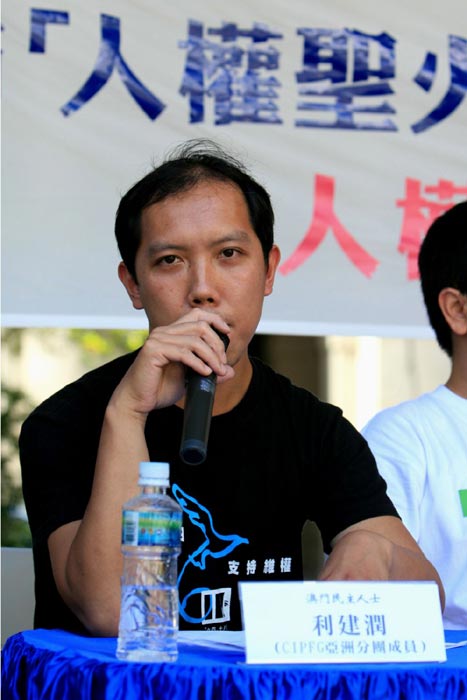 澳门成员利建润特别赶到香港出席招待会,他批评中共当局完全违背申办奥运的承诺,人权状况丝毫未有改善:「国内很多维权人士受到迫害,好多异见人士、政治异见人士遭到监禁至今未获自由,迫害宗教信仰,迫害法轮功学员和地下教会人士仍然继续,这个很明显和奥运会精神背道而驰,将二零零八年北京奥运沦为一个血腥的运动,我觉的是人类的耻辱。」