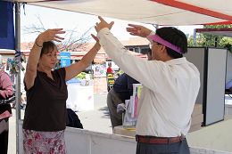 两天来,许多佛利蒙市的法轮功学员参加了讲真相活动。星期六,赵女士带着两个女儿一早就来到了摊位。她八岁大的小女儿Catherine手中拿着真相资料不停的在向游客讲着真相。遇到游客提出的比较难回答的问题,她就会向妈妈请教,然后再向游客讲。很多游客都耐心的听她讲真相。