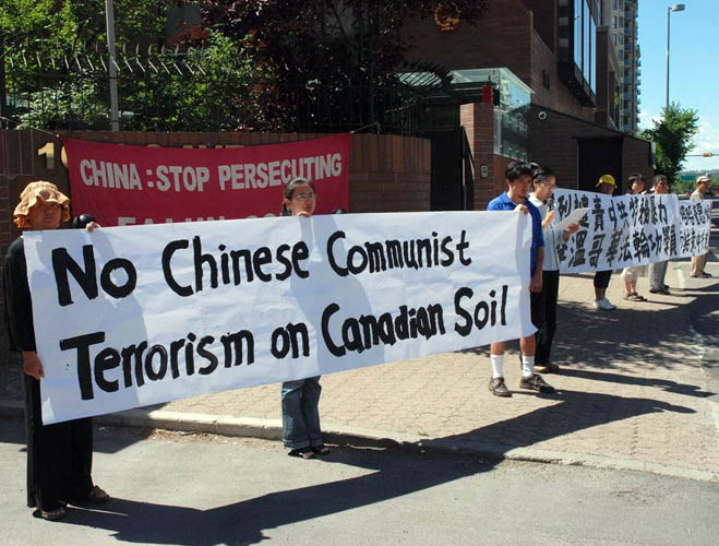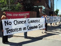 ![]() 卡尔加里法轮功学员在中领馆前抗议中共特务的暴行 |
