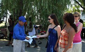 乐团成员王洪敏对记者说:“今天的游行真是人山人海,我们参加完游行后,就在人海中发法轮大法的真相资料,对着匆匆而过的人流说:‘Falun Dafa is good!(法轮大法好!)’人们都纷纷的接资料,后来我都忙不过来,我干脆就让人们自己拿我捧在手上的资料了。有人想详细了解情况,我就告诉他们资料上的网站地址。”