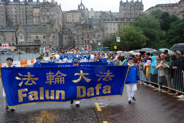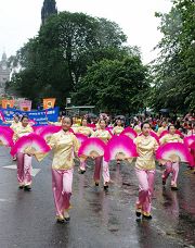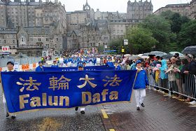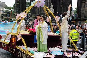 来自世界各地的八十多个团体参加本届艺术节大游行,据报道,沿途约五万观众冒雨观看了游行。法轮功团体的队伍由中英文的“法轮大法”和“真、善、忍”大横幅领头,一百一十多位学员组成的欧洲天国乐团紧跟于后,演奏着《法轮大法好》、《法鼓法号震十方》等曲目,法鼓法号声声撼人心,洗涤着世人的心灵。