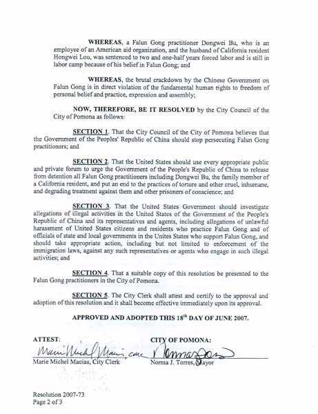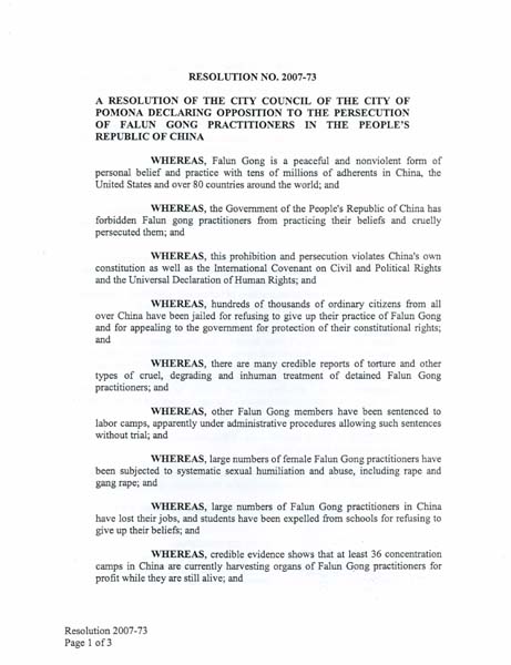 第一、帕莫纳市议会认为中国政府应该停止迫害法轮功修炼者;