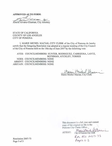 我,玛利¨米切尔¨玛希阿斯(Marie Michel Macias),作为帕莫纳市政职员,兹此证明上述决议案于二零零七年六月十八日在帕莫纳市议会会议上通过,投票结果如下:
