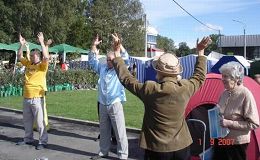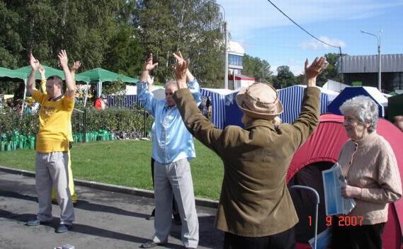 部份学员一直在旁边演示法轮功的五套功法。纯净的能量场吸引了很多人。有人感受到功法祥和当场跟学员们学功;有的表示想进一步了解法轮功。