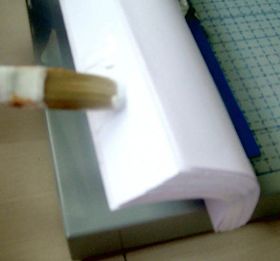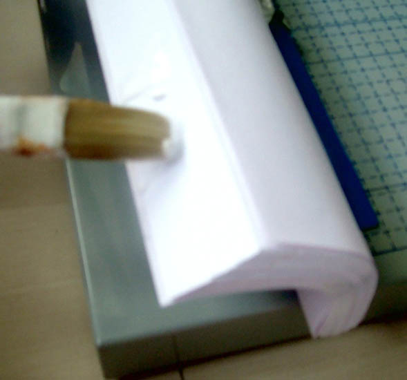 将书页码的一面朝下,墩齐,使用切纸机的挡板固定在切纸机上。将书籍向一侧弯曲,纸张与纸张间会错开,用刷子刷上白乳胶,这一步很关键,目地是为了让纸张的侧面能够接触胶水。如下图。