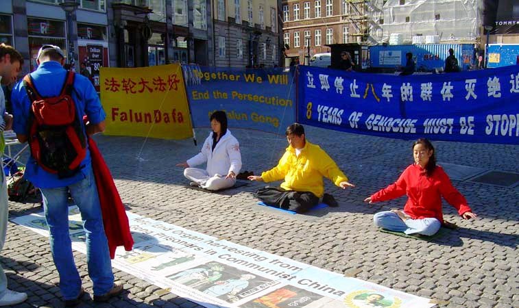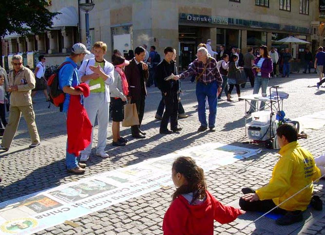 丹麦学员打开写有“法轮大法好”、“让我们携手立刻终止迫害”、“立即停止八年的群体灭绝迫害”等横幅,还同时展出法轮大法在世界的洪传盛况,以及法轮功学员在中国遭受酷刑迫害的图片。在祥和的音乐声中,有的学员演示着五套功法,有的向过往行人送上一份真相资料。闹市区中这安详、宁静的一隅,不由的吸引了过往人群的目光。