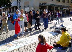 西人学员斯蒂芬和他的中国妻子一周前刚喜添小儿子,他们也来到这里,参加这支向世人传播大法福音的队伍。当妻子在广场中间静静的演示功法时,斯蒂芬在一旁不停的向人们介绍什么是法轮功、讲述着在中国大陆正发生的迫害。许多路人静静的听着,人们不可思议这场迫害能够如此残酷,难以置信为什么西方民主政府竟对此保持沉默,任由这场迫害延续至今。许多人难过的说:“这太可怕了”。