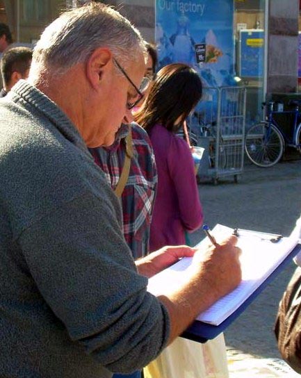![]() 丹麦老人了解真相后在反迫害征签簿上签名 |