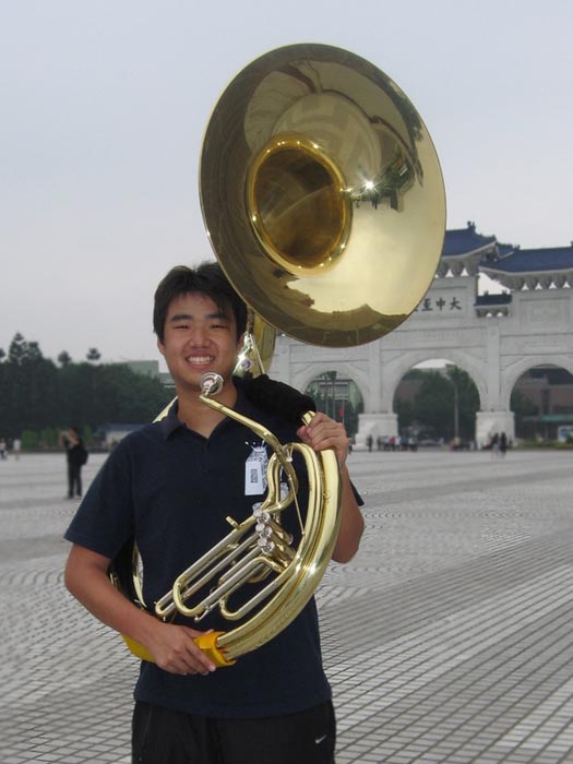 ![]() 钰豪参与台湾天国乐团的演出(此图是每周六在中正纪念堂团练) |