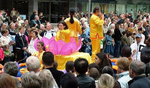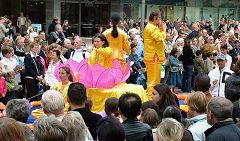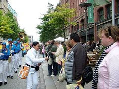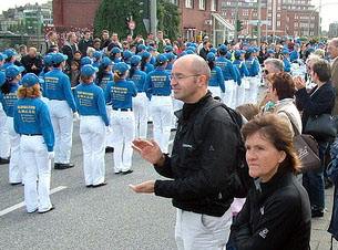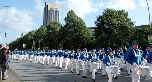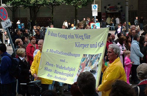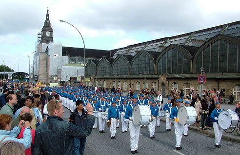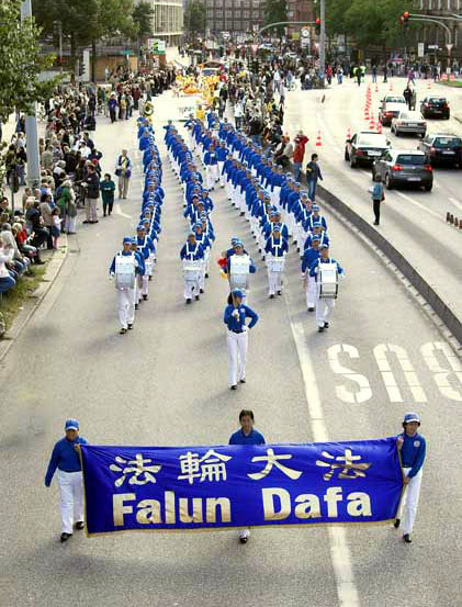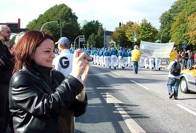 据汉堡居民介绍,每年这个时候,汉堡市政府都要和中共合办中国街活动。当法轮功学员的游行队伍经过中国街处子堤(Jungfernstieg)时,许多中国商家的工作人员闻声都跑出来看热闹。看到身穿“法轮大法好”字样服装的天国乐团在他们面前浩浩荡荡的走过时,很多人都呆住了。他们亲眼看到了纯正、壮观、由各种发色肤色组成的海外法轮功学员的队伍。一位明白法轮功真相的华人幽默的说:是中共把国人运出来接受法轮功的洗礼的。