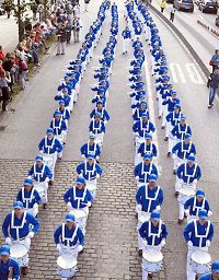 ![]() 上书“身心双修的功法法轮功,五套功法,真、善、忍”的横幅出现在游行队伍中 |
