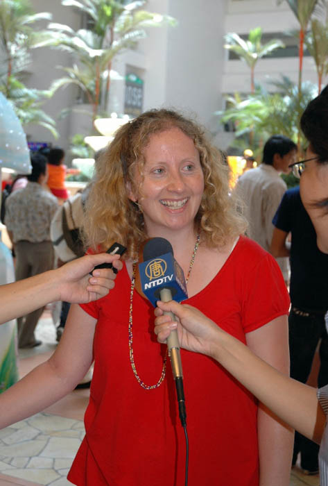 ![]() 英国的游客罗拉非常喜爱法轮功学员的腰鼓表演 |