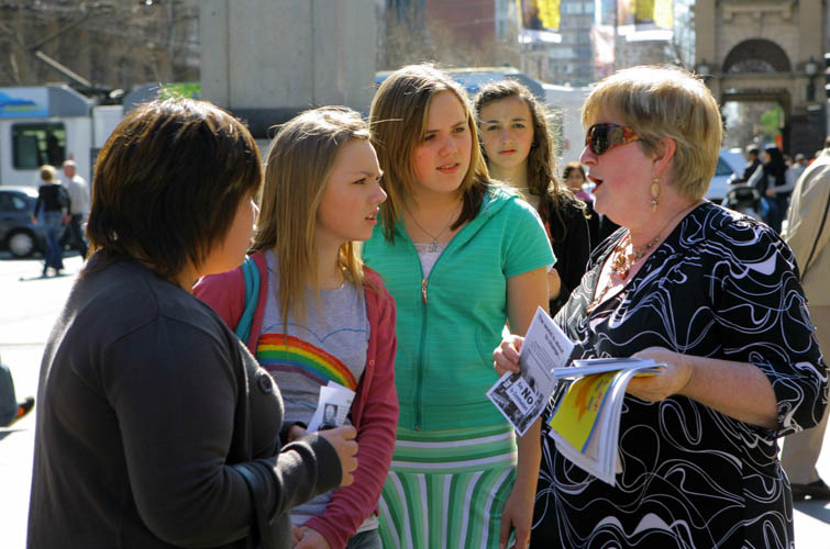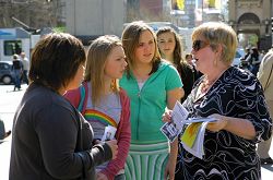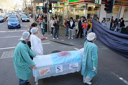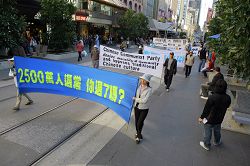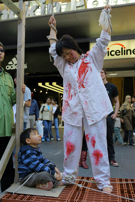 有两位从中国来的女孩在墨尔本上中学。今天路过退!党!集会现场,当义工问到时,她们表示已知道退!党!这件事,但是她们询问躺在手术床上的模拟场景和吊刑架是怎么回事,义工就向她们讲了中共迫害法轮功、甚至活摘法轮功学员器官的情况,还讲了中共在其发动的历次政治运动中所犯下的罪恶。两个女孩一直很认真的倾听这些她们在中国无法了解的事实。最后在现场就退了团队。