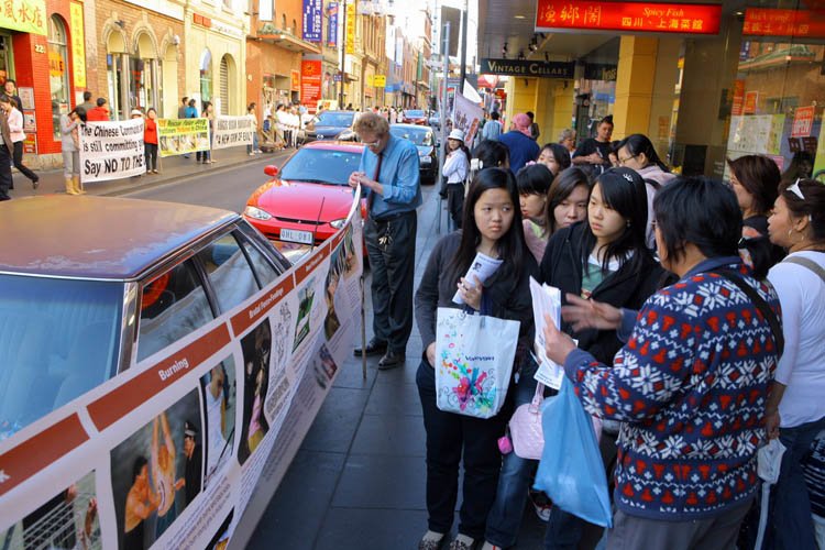 有一位已在墨尔本定居的女孩,曾经就读于中国南开大 学。她一清早就来到现场观看展板,对共产党的罪恶很有认识。她说她在中国就遇到过几件事:她曾经在天安门广场看到打横幅的人很快就被警察抓走,她知道打横幅的人的命运,会发生无法想象的事;有一次南开的六、七个日本学生在校内湖上滑冰时跌入湖中,其中一人死亡,当时赶来的媒体记者都被禁止报导,所有知情人都被封口,据说怕影响「中日关系」;她还经历过一次饮料中毒事件,被送往医院后,当局也禁止真相曝光……从中可以看出多少真相被掩盖了,中共一贯善于造假,以此愚弄老百姓。