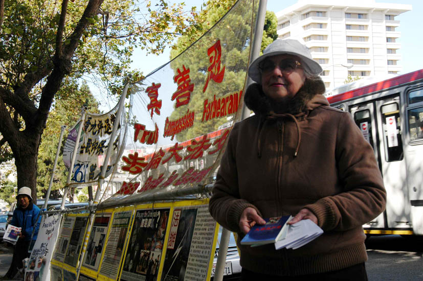 ![]() 旧金山中领馆前和平抗议的法轮功学员 |