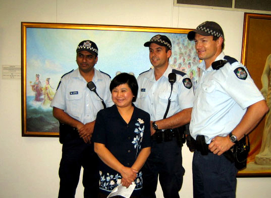 旅居澳洲的女画家章翠英女士特从悉尼飞到布里斯本参加开幕仪式。她在致词时介绍,传统的中西方艺术是神传给人类的,目的是使人类的道德回升,人心向善。她表示:“本此绘画展净化了我们的思想和身体,了解了修炼真善忍的法轮功学员,更了解了中共迫害法轮功的真相,知道了中共迫害人权的邪恶本性。”